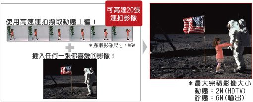 擷取影像尺寸:VGA (640x480) 主體可從高達20張一系列的連拍影像中被擷取出來。