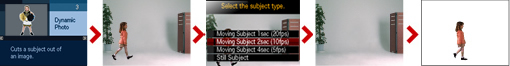 使用拍攝秘笈的動態照片來擷取主體。首先,請依照正常方式拍攝相片。接著,請再拍一次相同的背景,但這次主體不要入鏡。這個動作能讓相機知道主體位於影像的何處,以便用來擷取主體。您再也不需使用那些麻煩的編輯軟體裁剪影像。 •拍攝靜態主體時,無法使用連續快門。