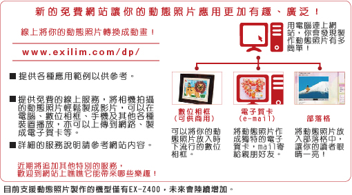 EXILIM讓瀏覽影像縮圖更有趣!嶄新的”動態縮圖呈現”效果,讓你彷彿踏上回憶的長廊,鮮明的印象無限地向前延伸......