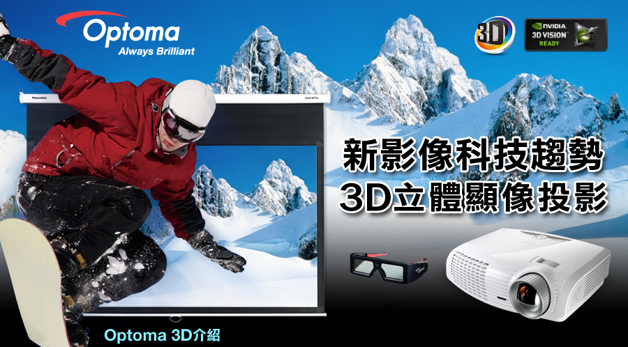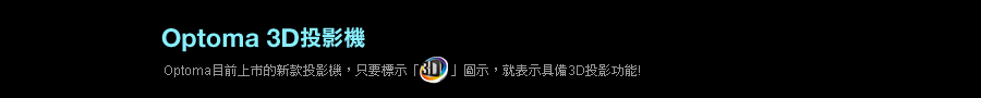 3D投影機是一台具有120Hz高更新頻率的新科技投影機。當開啟3D功能,就變成3D投影機。未來各種不同的3D內容與播放裝置,只要能將雙眼畫面以左右順序方式在投影機的3D容許解析度下輸出,Optoma