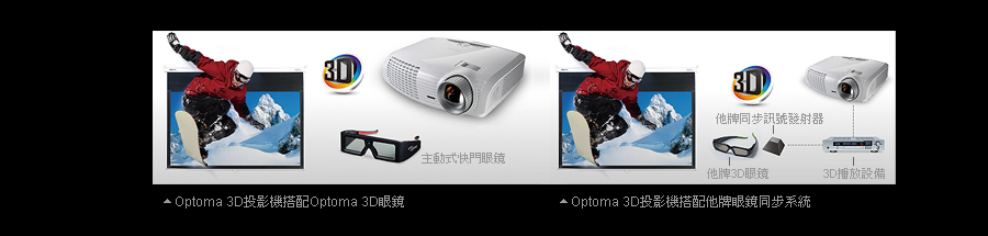 3D投影機不需要安裝特殊銀幕,除了可以與Optoma 3D眼鏡作同步外,也能搭配其他廠牌的3D眼鏡+同步系統。 |