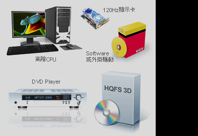 以播放機(光碟式或硬碟式)而言,播放機必需能夠處理3D雙畫面並以左右順序方式輸出才能播放3D影片。 目前現有的DVD播放器在播放HQFS格式3D