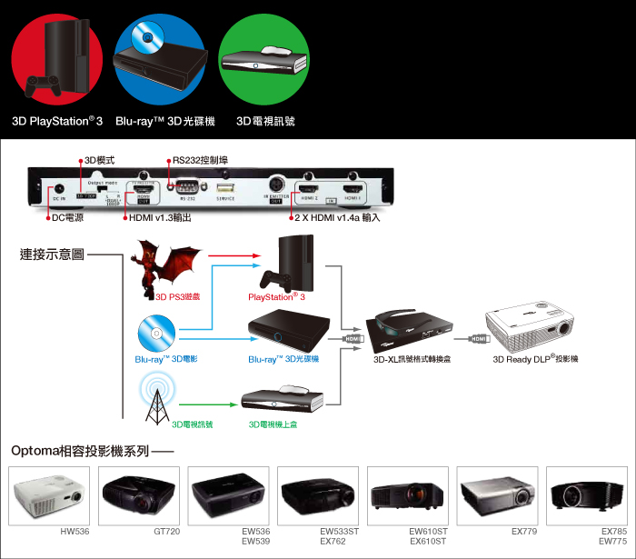 世界第一台3D訊號格式轉換盒正式誕生!使用DLP-Link技術的3D投影機從此能夠播映各種3D訊源了!輕輕鬆鬆一網打盡PlayStationR3、藍光3D、立體電視訊號(如SKY