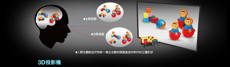 投影機屬於顯像設備,負責3D影像系統中最重要的成像顯示任務-同時顯示兩組影像。投影機要能夠同時顯示兩組影像,必需具備每秒120張畫面(120Hz)的顯示能力,投影機將每秒120張畫面平均分配給左右兩眼影像,也就是左右眼每秒各顯示60張畫面。 但須注意,只是單純具有120Hz顯示能力的顯示設備不代表就具有3D功能,投影機還必需要能和3D眼鏡同步,才算具有完整的3D功能。 |
